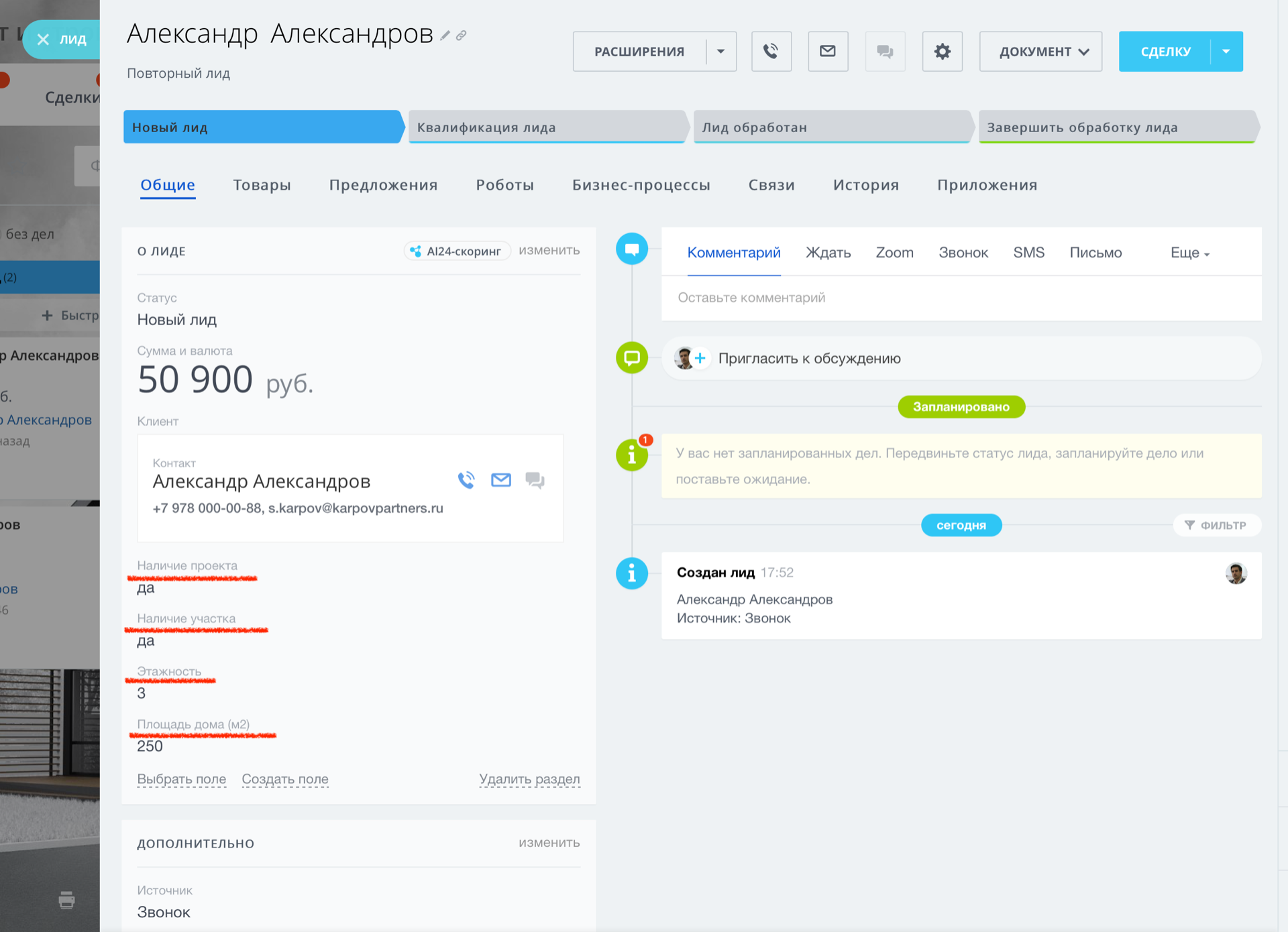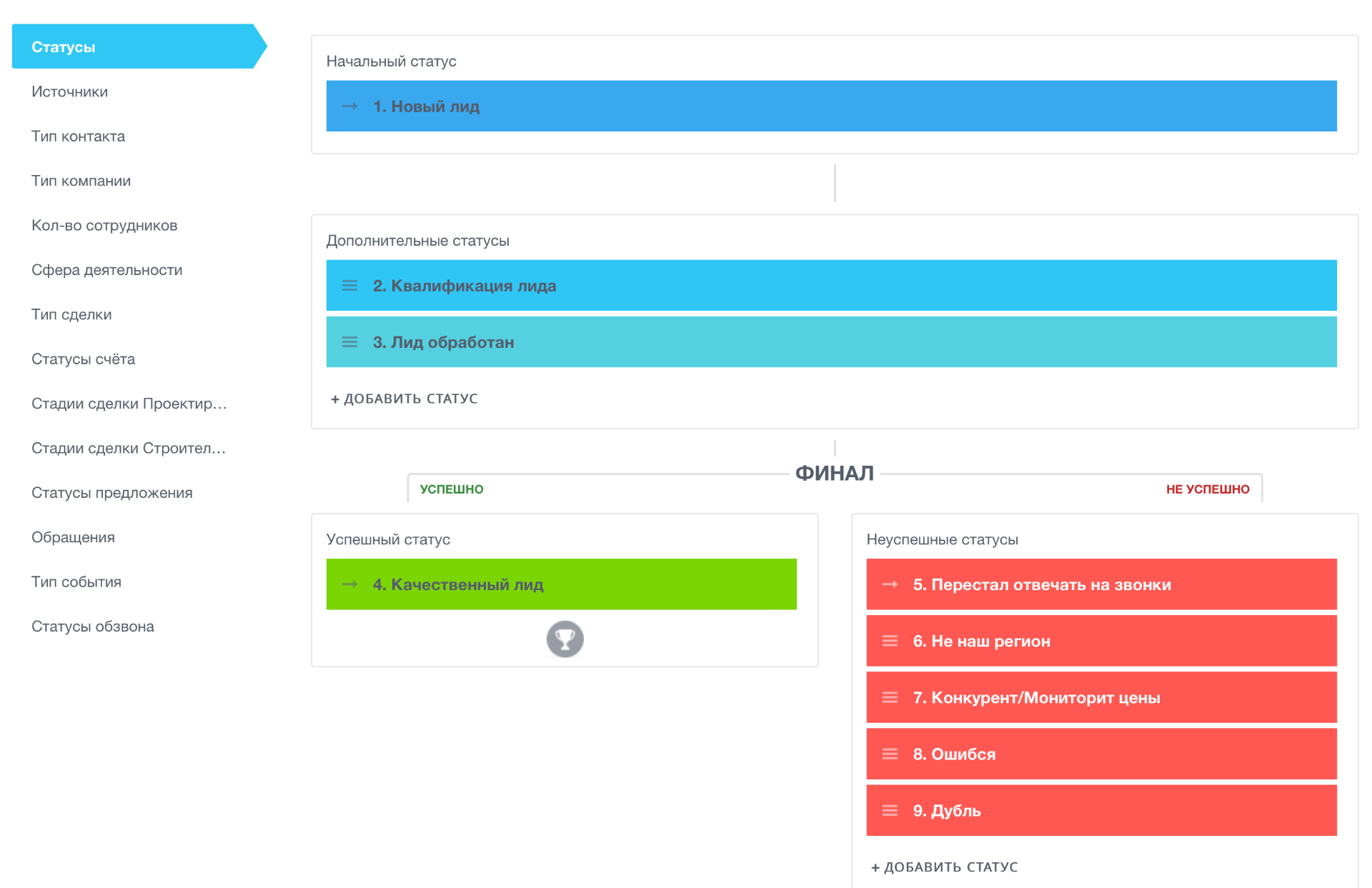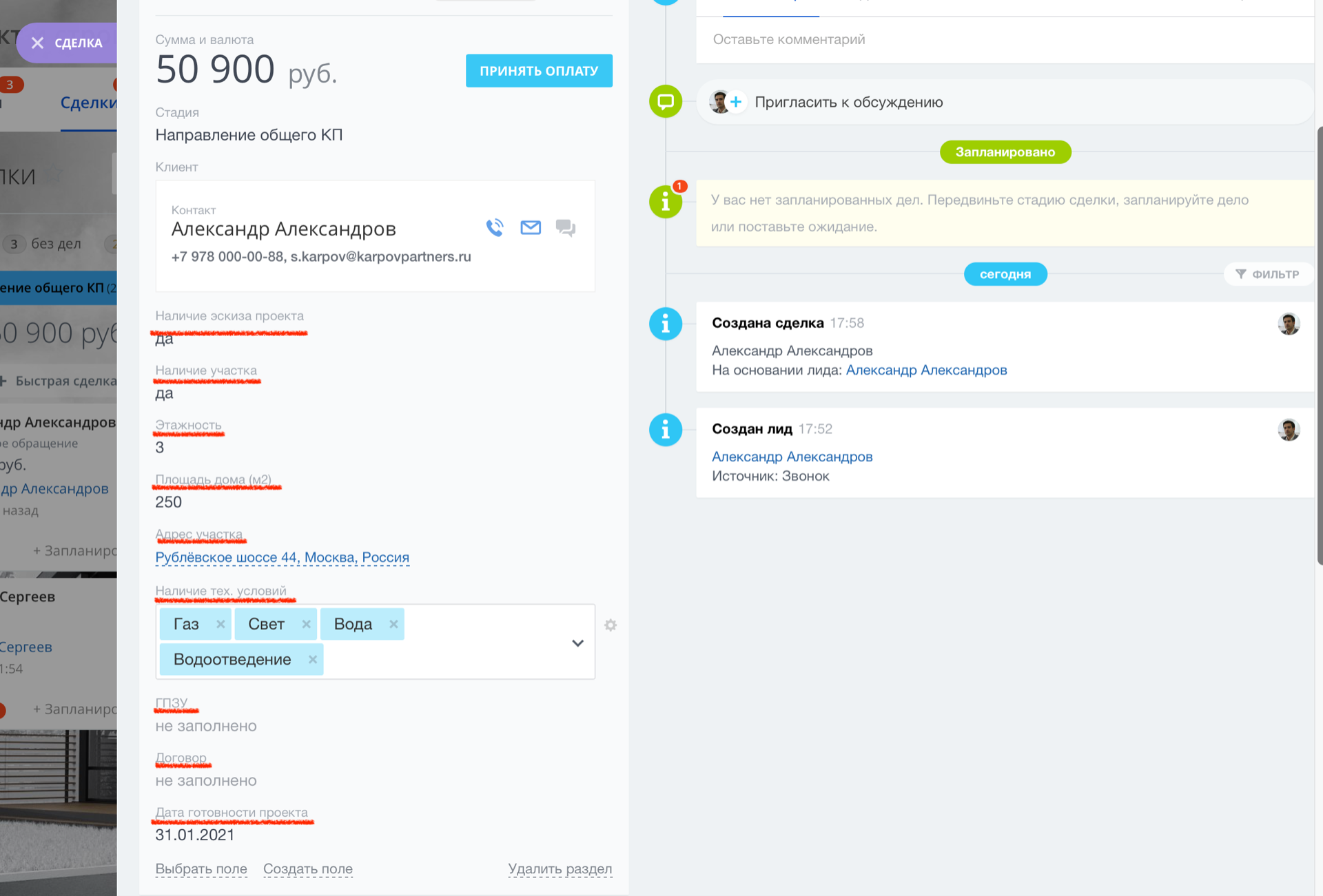 - 2 направления сделок: «Проектирование дома» и «Строительство дома».